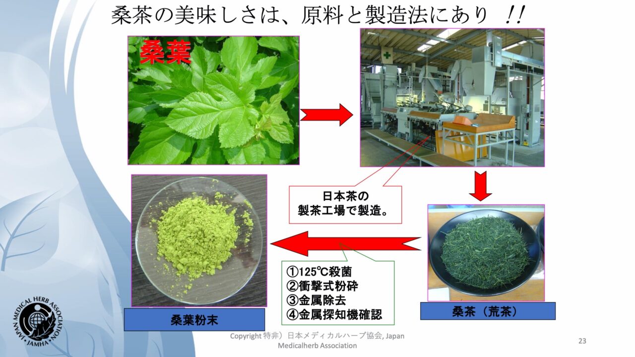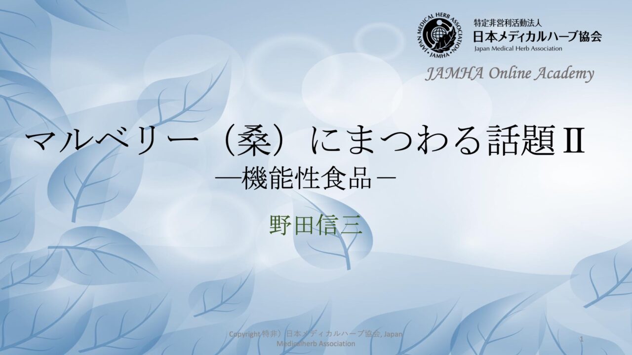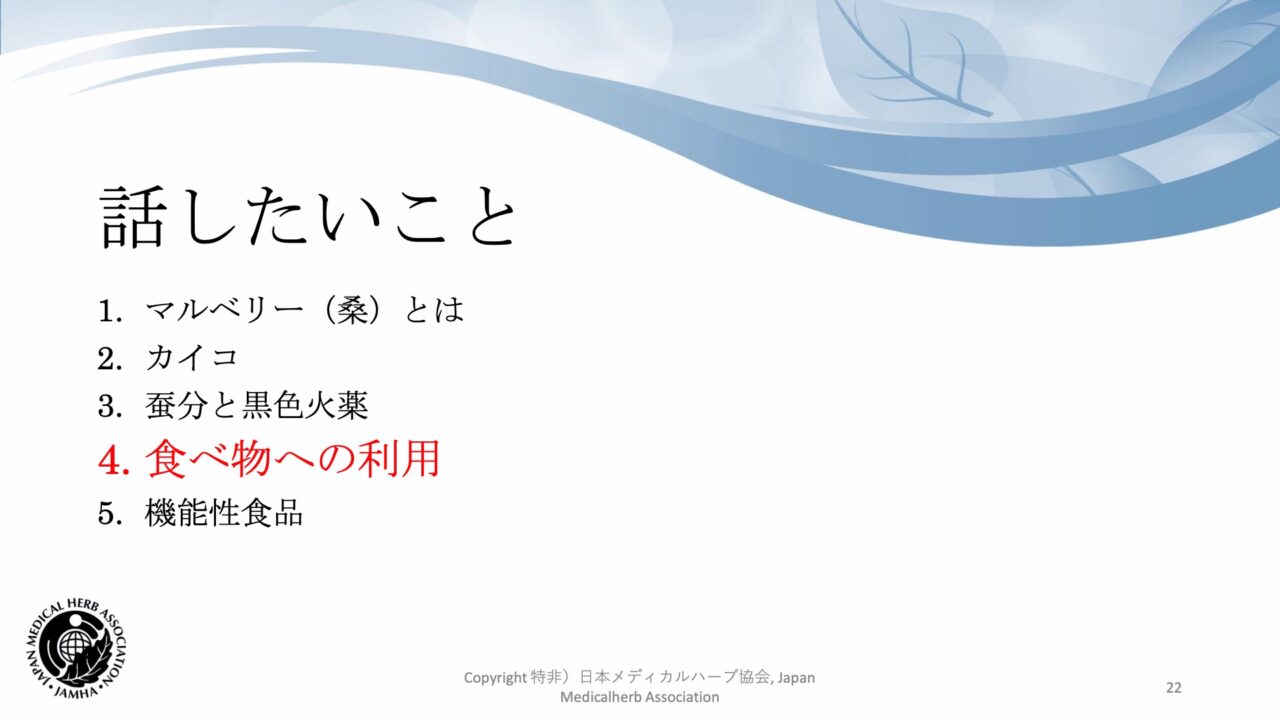 桑の歴史とマルベリーの薬理作用について学ぶ講座です。全2回講義の第2回では、桑葉の機能を表示する機能性表示食品制度を中心に解説します。