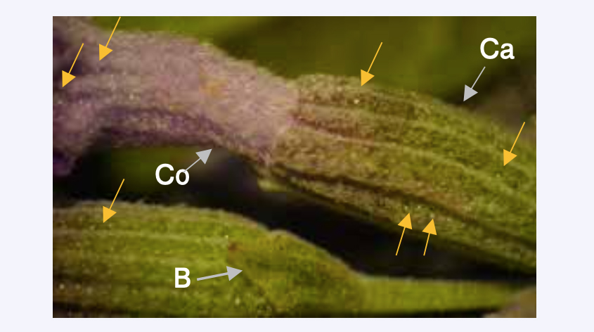 インテルメディアの花冠(Co)と萼(Ca)、苞葉(B)。萼や花冠にきらきら光っているのが腺毛(→)で、内部に精油を含有し、外敵などによって腺毛が壊されると精油を分泌する。