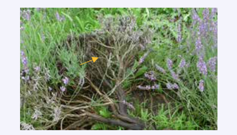 アングスティフォリアやインテルメディアが5~6年経つと一枝ずつ枯れていく現象をよく目にします。これは、道管病と呼ばれる、道管を塞いでしまう土壌病害によるもので、ラベンダーではフザリウム菌によるものと考えられます。この病原菌は土壌に棲みついていて、ラベンダーが大きくなって根元が自重で裂けた時に、その裂け目から、雨の跳ね返りなどで侵入して維管束内の道管を塞いでしまいます。道管が塞がれるとその先に水が行かずに、その枝だけが枯れることになります。やがて、すべての道管が塞がれると株全体が枯死します。これを防ぐには、株元だけ水はけをよくして無菌に保つ必要があります。鉢底の大きく空いた素焼き鉢に、鹿沼土や籾殻くん炭、火山礫などの微生物のいない水はけのよい土を入れてそこに苗を植え付け、その鉢ごと地面に植えると、株元での菌の繁殖を抑え、栄養は鉢底から伸びた根で吸収することができます。