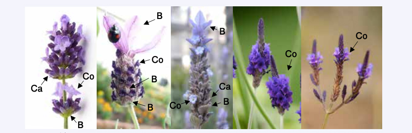 ラベンダーの花穂。左から、アングスティフォリア、ストエカス、デンタータ、ムルティフィダ、カナリエンシス。イングリッシュ系では苞葉は発達せず萼がむき出しになるが、そのほかの種では苞葉が萼を隠すように発達。萼は筒状を呈するため萼筒とも呼ばれる。ストエカスでは萼が外から完全に見えないが、デンタータでは苞葉がルーズで萼がところどころ顔を出す。フレンチ系では頂部の苞葉が花弁の様に発達して色づく。Co;花冠、Ca;萼(萼筒)、B;苞葉