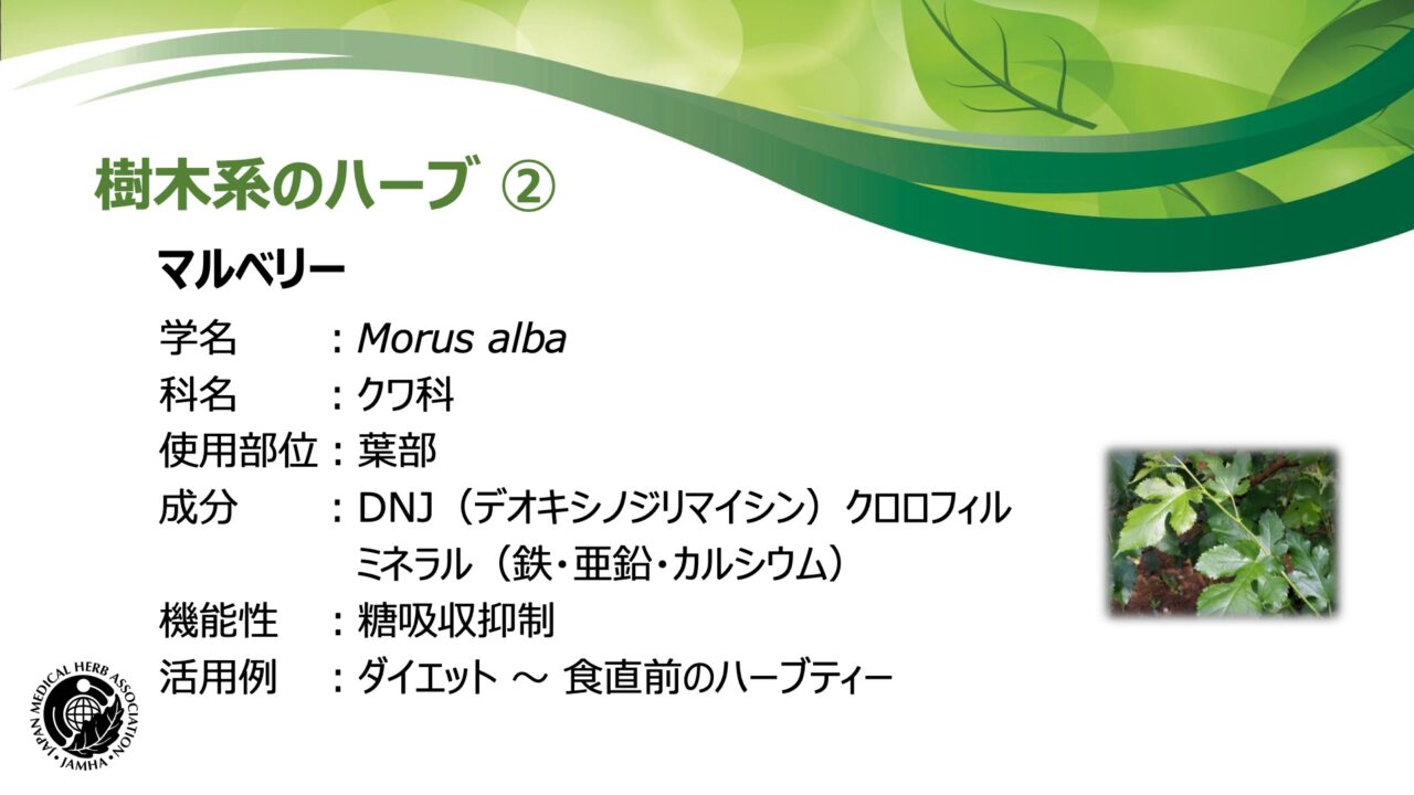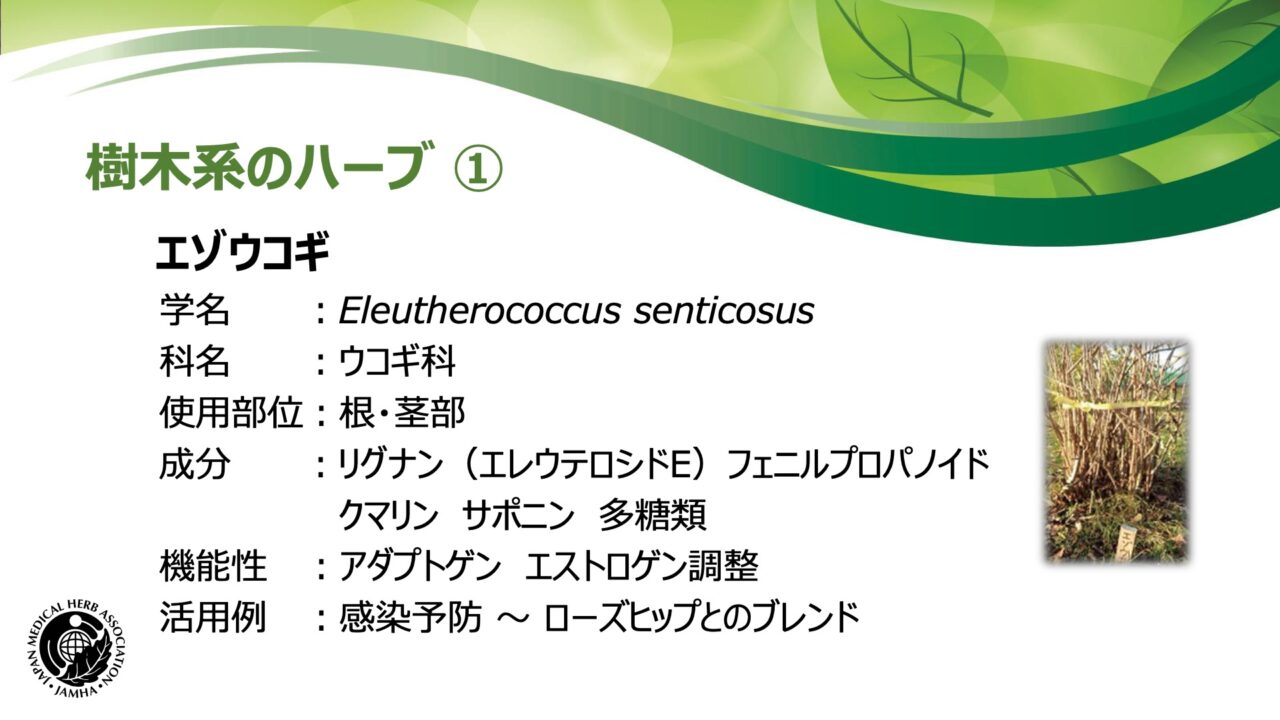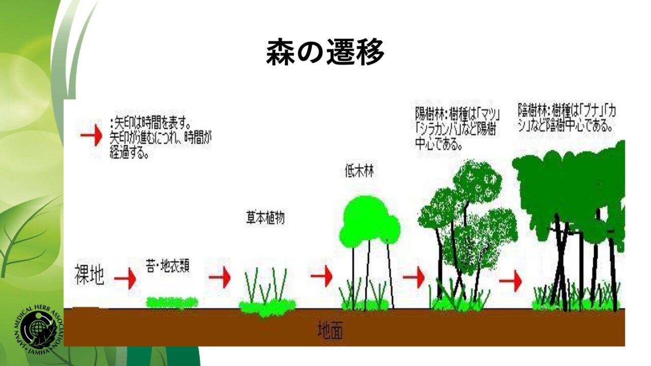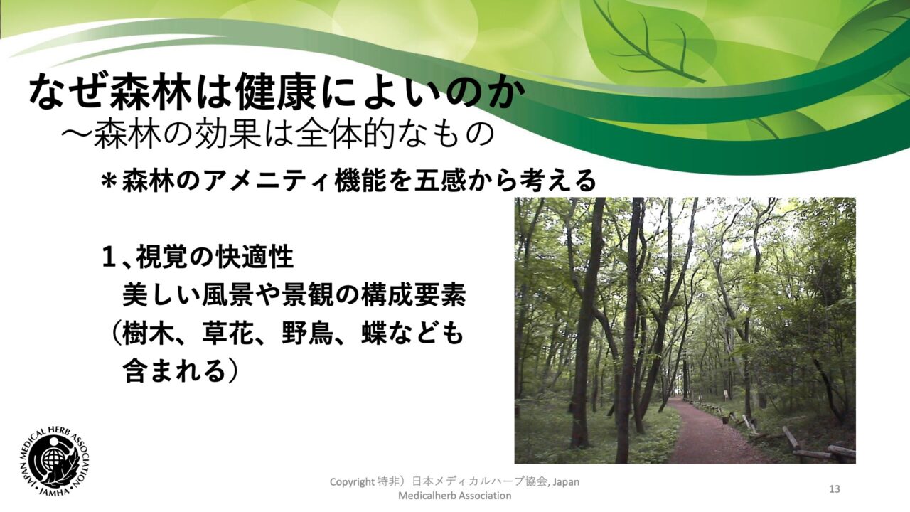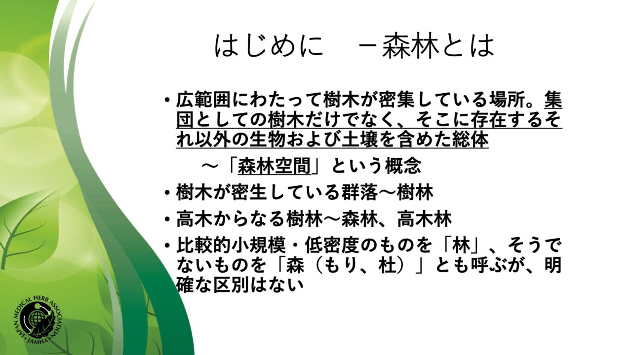樹木系の植物療法の講座です。前半をメディカルハーブやアロマなどの「樹木系の精油とハーブの機能性」について、後半を癒しや健康に関わる「森林療法」について解説します。
