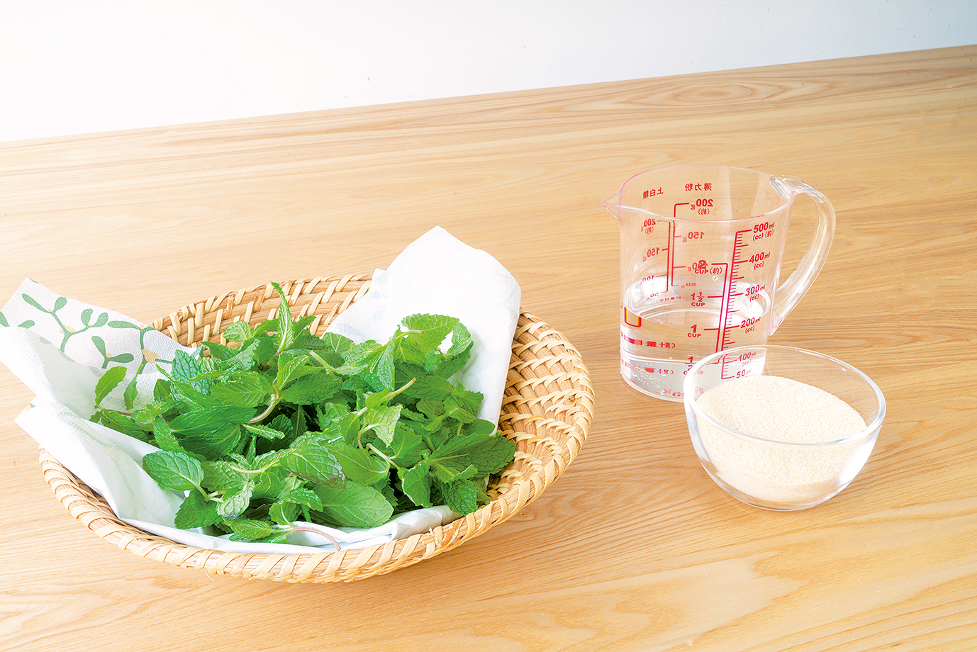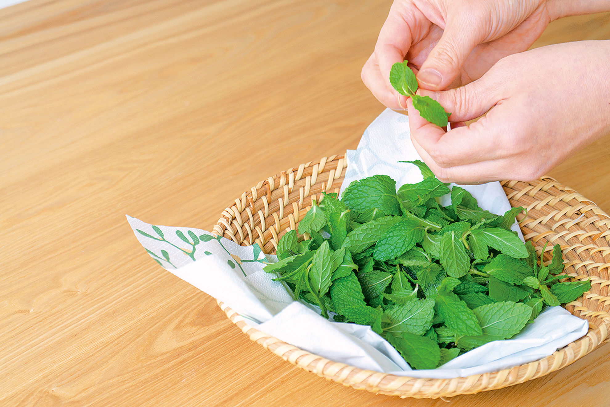 ①水洗いしたミントの葉を茎から外す(茎を外すことで、苦味や雑味をとる)。