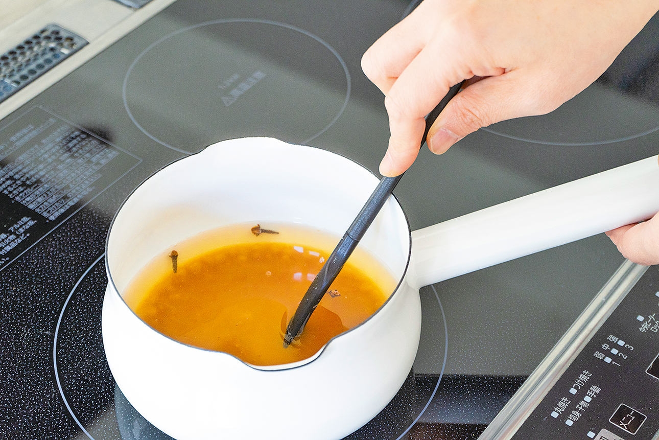 ②水ときび砂糖、クローブを鍋に入れ火にかける。
