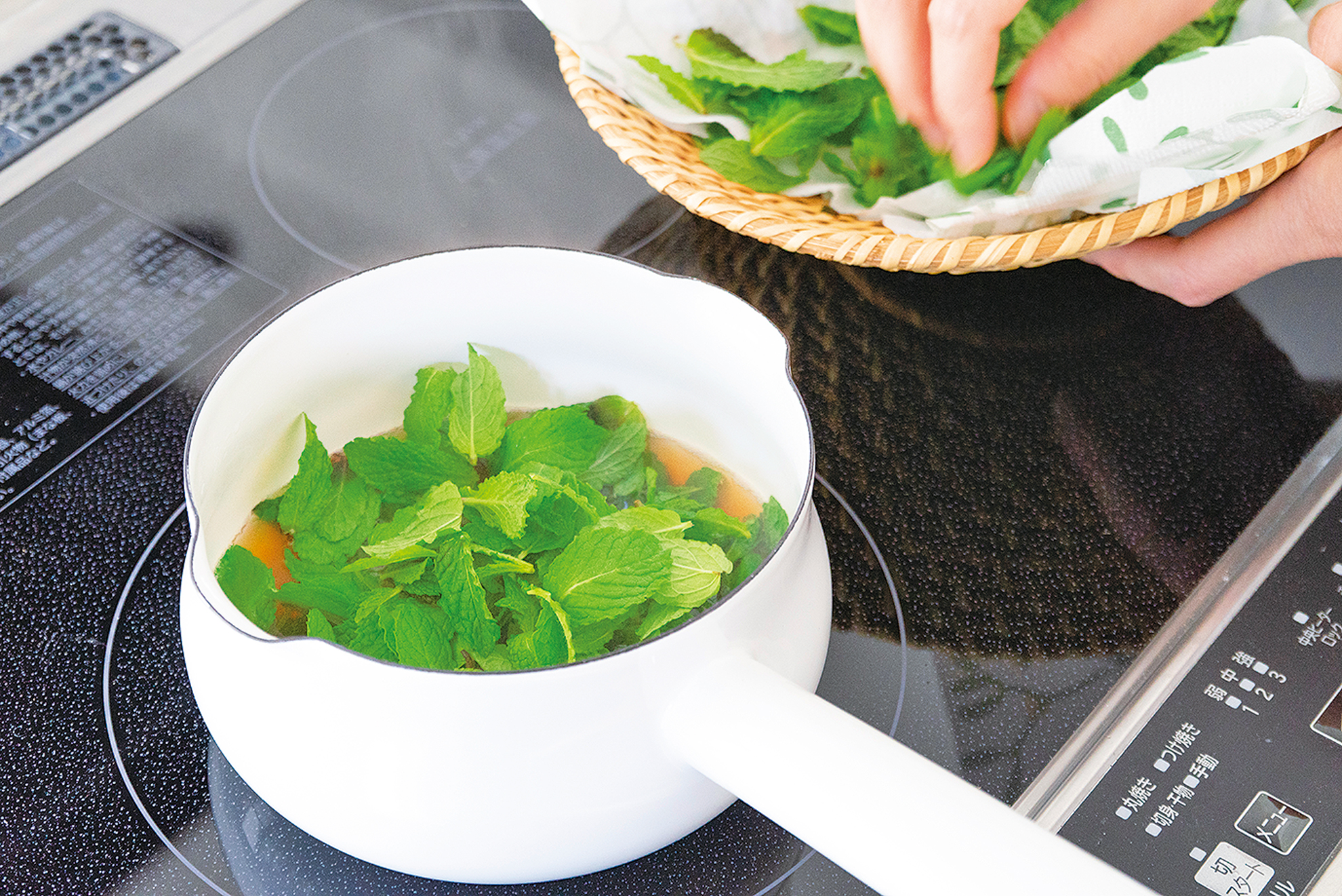 ③きび砂糖がきれいに溶けて沸騰したら火を止め、ミントの葉を入れる。
