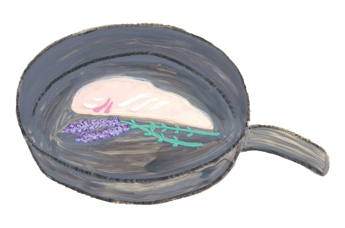 皮がパリッとするまで弱火でじっくり焼き、裏側からは余熱で火を通すぐらいがふっくら焼くコツです。ラベンダーはぜひフレッシュなものを使ってみてください。