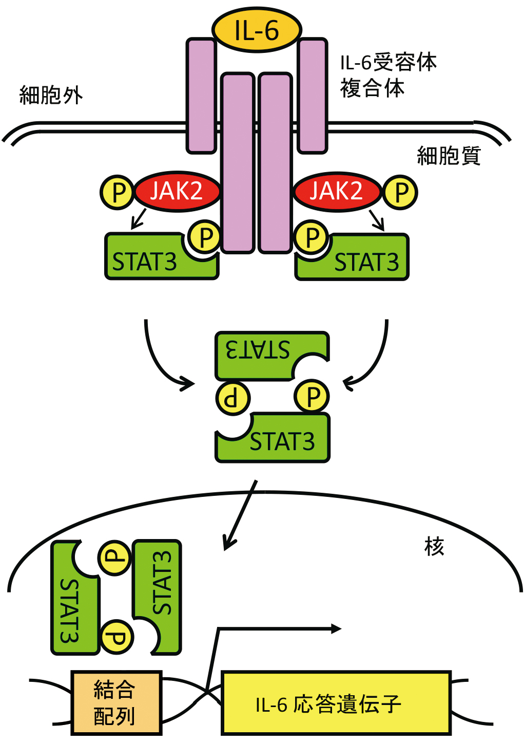 STAT3は、サイトカインや成長因子の刺激で、細胞内で情報伝達に関わる転写因子として機能するが、がん細胞ではこの情報伝達が異常に働いて、がん化に関わる。この図は、STAT3の関与する情報伝達系の例として免疫制御に関わるサイトカインIL-6(インターロイキン-6)による遺伝子発現制御を示した。STAT3は、IL-6刺激により、IL-6受容体複合体に会合したJAKキナーゼによってリン酸化(Pで示す)され、二量体となって、核に移行し、IL-6応答遺伝子の転写を促進する転写因子として、機能する。