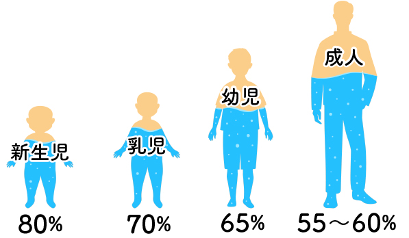 生まれたばかりの赤ちゃんは体の約80%、幼児でも約70%は水分でできており、皮膚からの蒸発や呼吸で失われる水分も多く代謝も活発であることから、大人より多くの水分を必要とします。