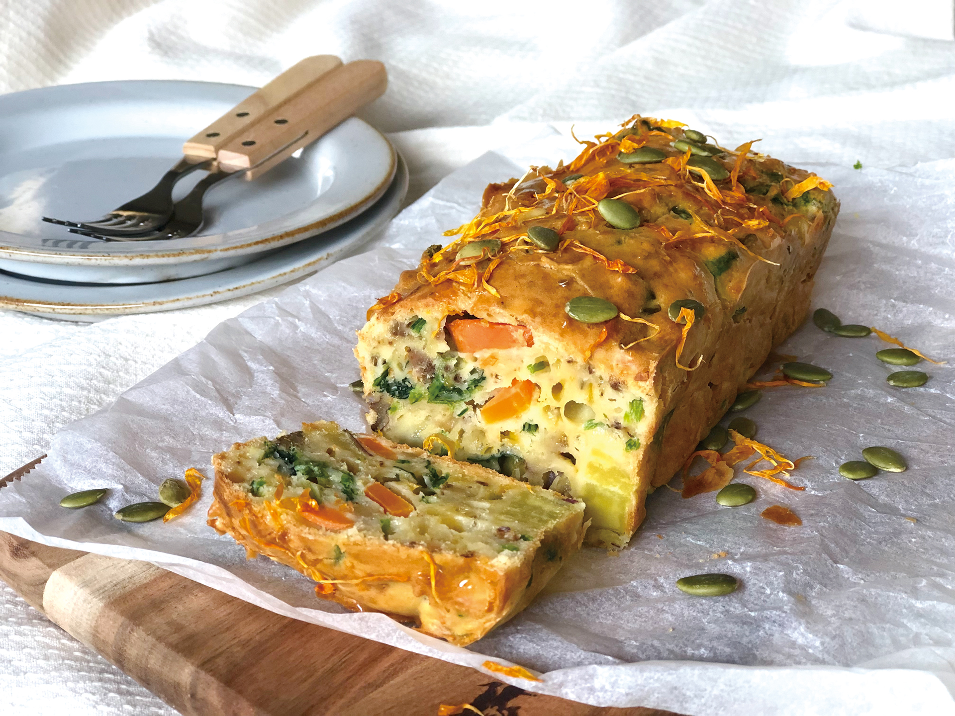 季節のハーブを楽しむレシピ : 冬野菜とカレンデュラのケークサレ