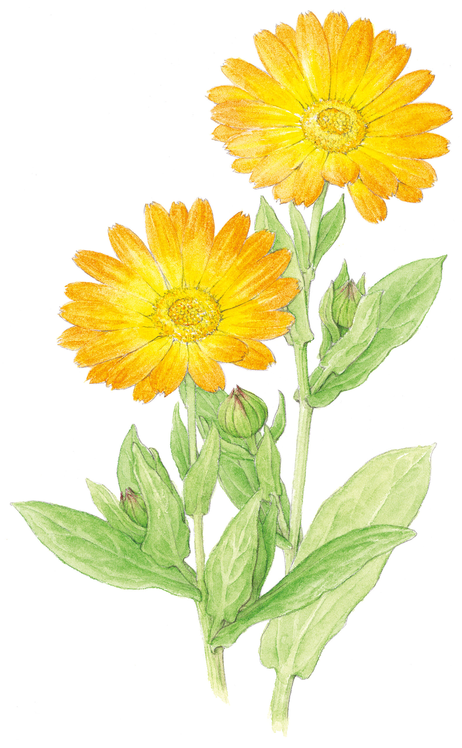 薬用では、傷、吹き出物、湿疹、おむつかぶれ、日焼け、虫刺され、真菌感染症、膣カンジダ症、帝王切開の創傷、放射線皮膚炎、口腔粘膜の炎症、結膜炎などの皮膚や粘膜の疾患に、ティーやチンキ、軟膏などで用いられます。ドイツではコミッションE で花を口腔粘膜の炎症や傷、潰瘍への外用を認めています。カナダでは保健省の自然健康製品成分データベースに掲載されています。米国では花弁が化粧品や栄養補助食品、ホメオパシー療法で使用されています。