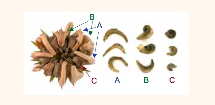 カレンデュラの開花後の頭花の結実時の状態(左)と、代表的な3タイプの痩果(右)。頭花の外側には、湾曲して背軸側に突起をもつ大型のタイプ(A)と、果実の両脇に薄い翼(よく)が発達して膨らんでいるタイプ(B)が取り囲むように並ぶ。その内側には小さなC字状~リング状に丸まったタイプがあり、中心部分に果実はない。八重咲ではCタイプが多くなる。