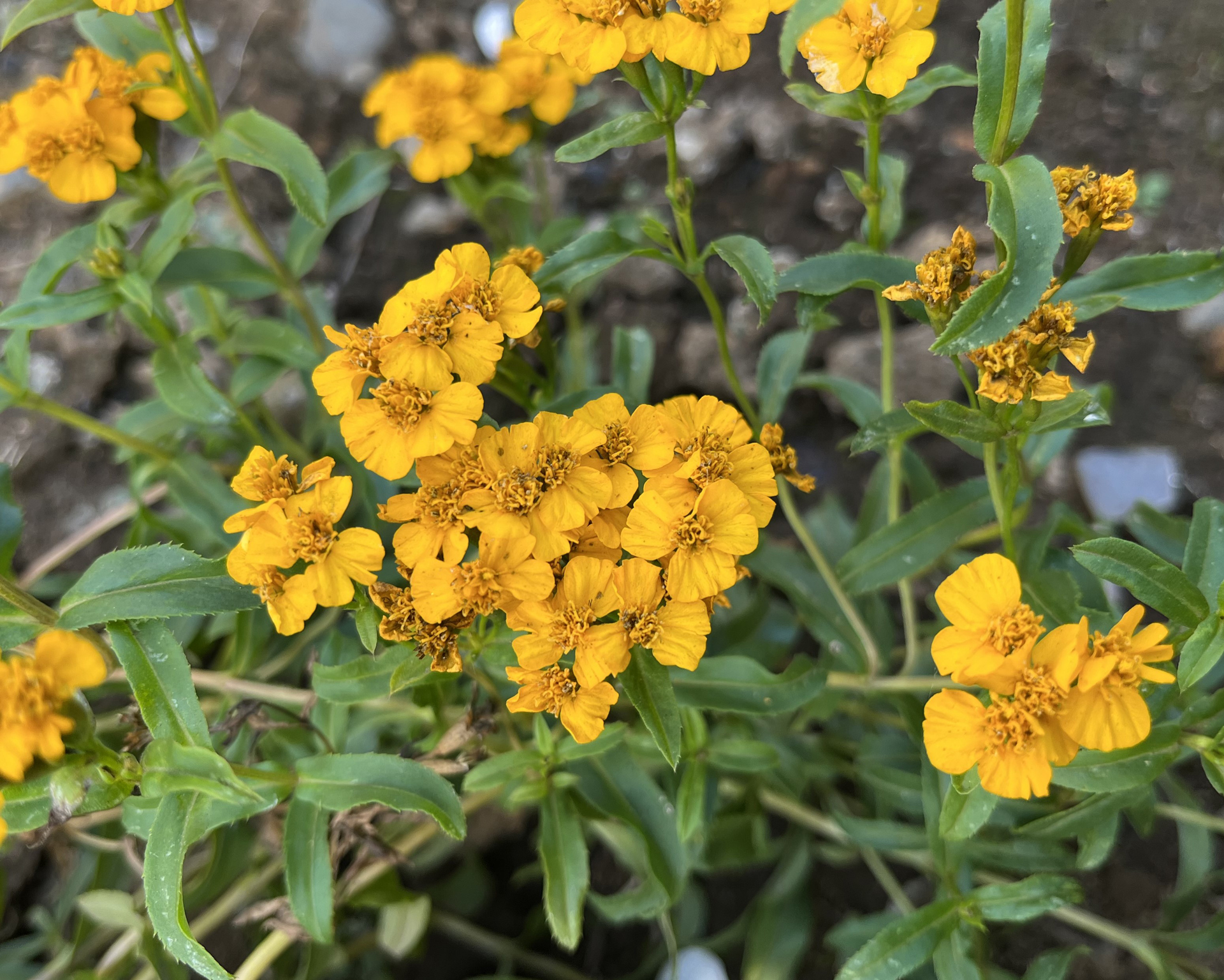 一般名 ミントマリーゴールド、ニオイマンジュギク(匂万寿菊)、ニオイコウオウソウ(匂紅黄草)、Mexican mint marigold, sweetscented marigold, Mexican marigold, Mexican tarragon, pericón, yerbanís