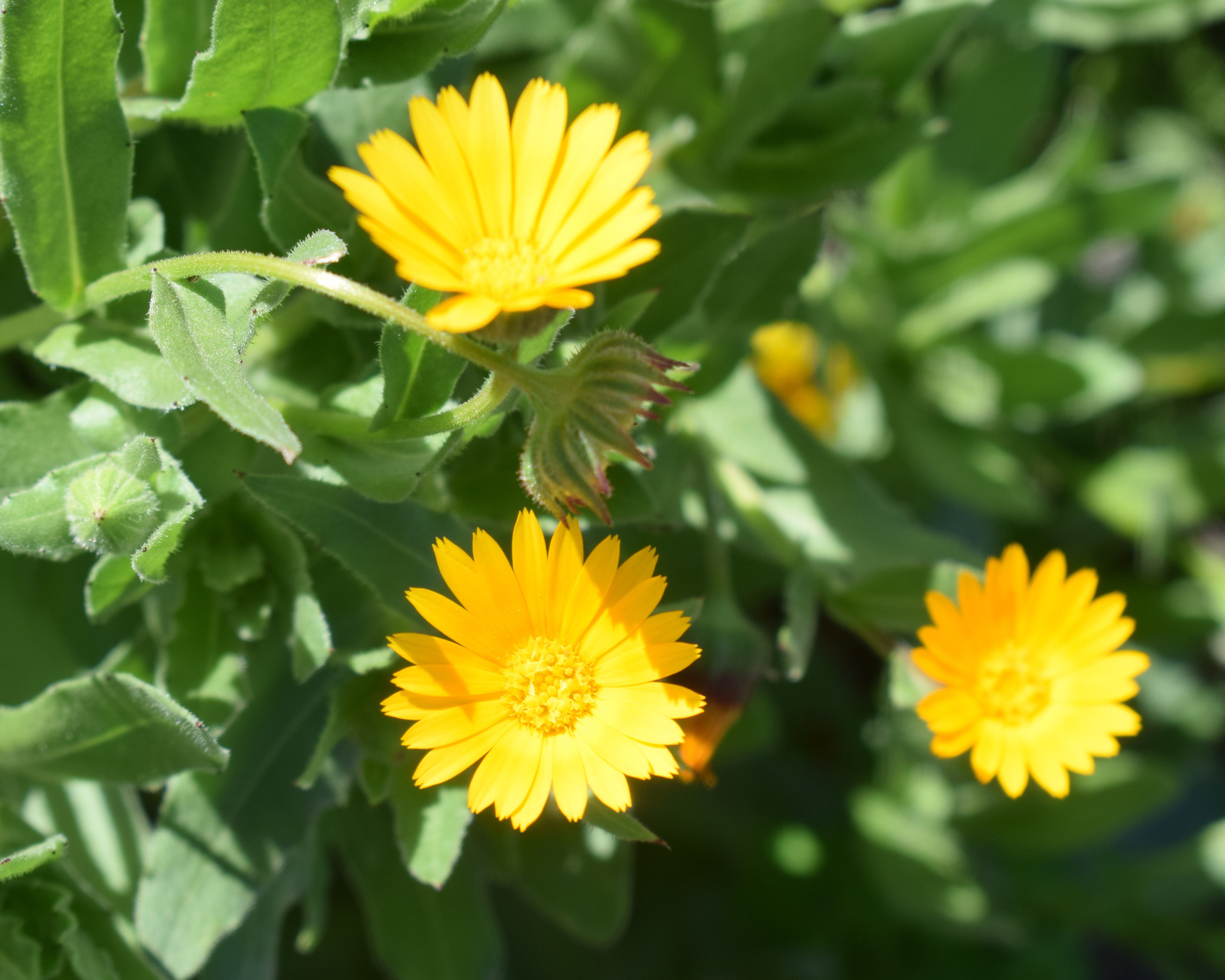 カレンデュラは全草に精油を含有します。これまで、葉に32%、花に31%のα-カジノールを含有し、高い抗酸化作用と酵素阻害特性を有すること(Ak et al., 2021)、全草の水蒸気蒸留(コホベーション)の結果、収油率0.3%、主成分はα-カジノール25%で、花と異なり茎葉にはモノテルペン炭化水素を含有すること(Chalchat et al., 1991)、ブラジル産の花からは水蒸気蒸留でα-カジノール20%、δ-カジネン23%、γ-カジネン9%が、ヘッドスペース固相マイクロ抽出でδ-カジネン22%、γ-カジネン25%が、ヘッドスペース・コールドフィンガー抽出でδ-カジネン18%、γ-カジネン25%が得られ、α-カジノールは水蒸気蒸留でしか得られなったこと(Gazim et al., 2008a)、ブラジル産の花の水蒸気蒸留でd-カジネン23%、α-カジノール20%、エピ-α-ムロロール13%が得られ、優れた抗真菌活性を有すること(Gazim et al., 2008b)、南アフリカ産では水蒸気蒸留での収油率が新鮮葉で0.06%、乾燥葉で0.03%、新鮮花で0.09%であり、精油成分は新鮮葉でT-ムウロロール41%、α-ツジェン19%、 δ-カジネン 11%、乾燥葉で1,8-シネオール 29%、α-ツジェン18%、T-ムウロロール13%、δ-カジネン9%、β-ピネン7%、新鮮花でα-ツジェン27%、T-ムウロロール25%、δ-カジネン13%であり、乾燥の影響の大きいこと(Okoh et al., 2008)などが報告されています。