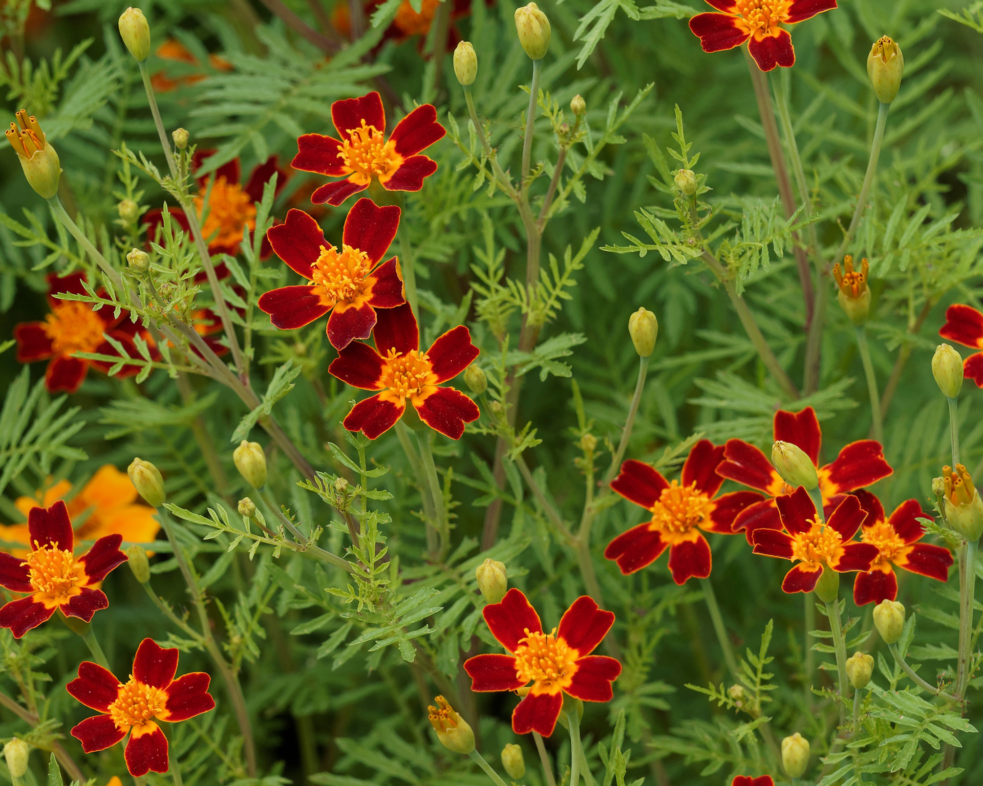 特徴 メキシコ~グァテマラ原産。フレンチマリーゴールドの名は新大陸発見後、フランスを経て欧州に広がったことに由来。一年草。草丈30~50cm。 葉は長さ3cmとアフリカンマリーゴールドよりも小さく、奇数羽状複葉の様に7~9枚に深裂し、裂片は細く鋸歯がある。花は直径3~6cmとアフリカンマリーゴールドよりも小さく、一重、八重のほか、管状花の盛り上がったクレスト咲きなどがある。花色は黄、オレンジ、赤。開花期が長く、花壇花として世界中で多用される。香料原料としても重要。ヒンドゥー教で儀式に多用されるほか、タイではダーオルアンと呼び、1967年にプミポン国王がオランダから持ち帰って以降急速に普及し多用される。氷点下1℃までは枯死しない。