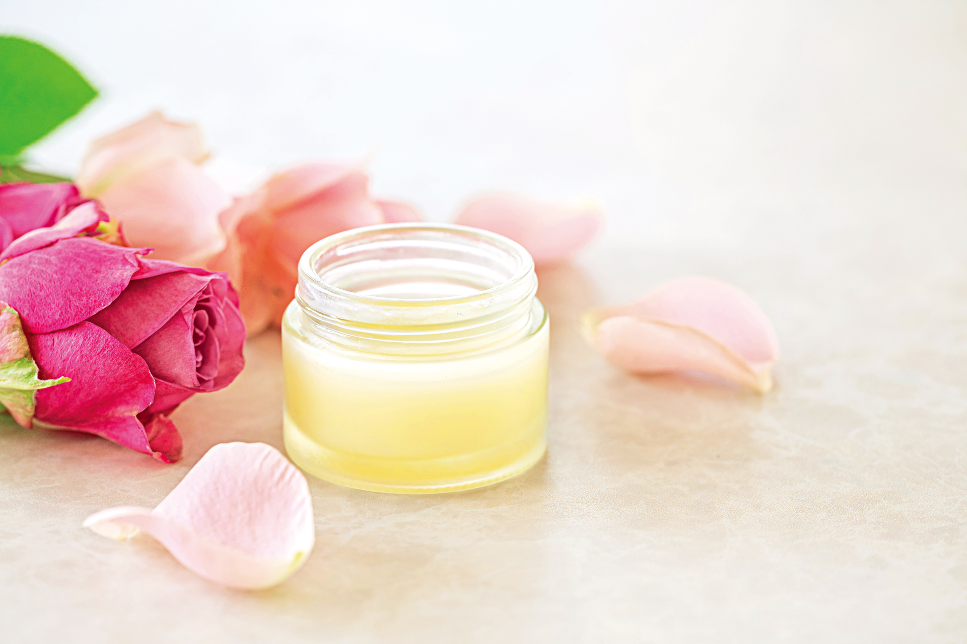 精油を使ったバームは、浸出油のように漬け込む時間が不要なので、より手軽にできるでしょう。ローズのフェイシャルバームは、ちょっとゴージャスな香りで、心を明るくしてくれます。