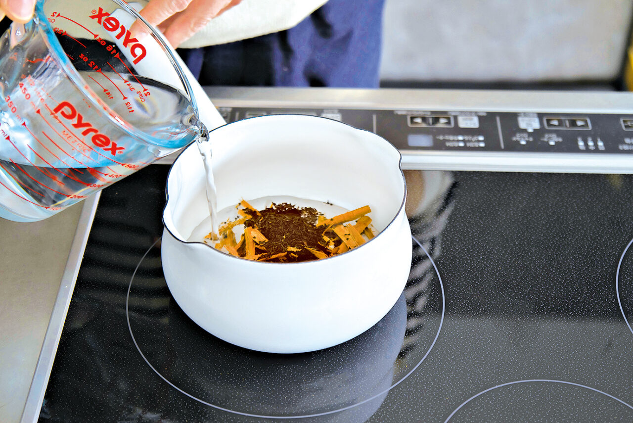 - 小鍋に紅茶葉と水、シナモン、クローブを入れ、強火で沸かす。