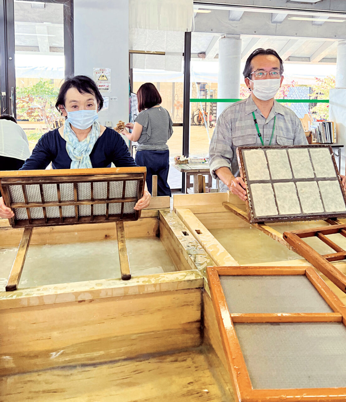 昼食後、いの町紙の博物館での紙漉き体験。術指導員の手ほどきを受け、思い思いに花や葉をのせ、乾燥時間を含め1時間ほどで完成。皆、自分の作品に満足。