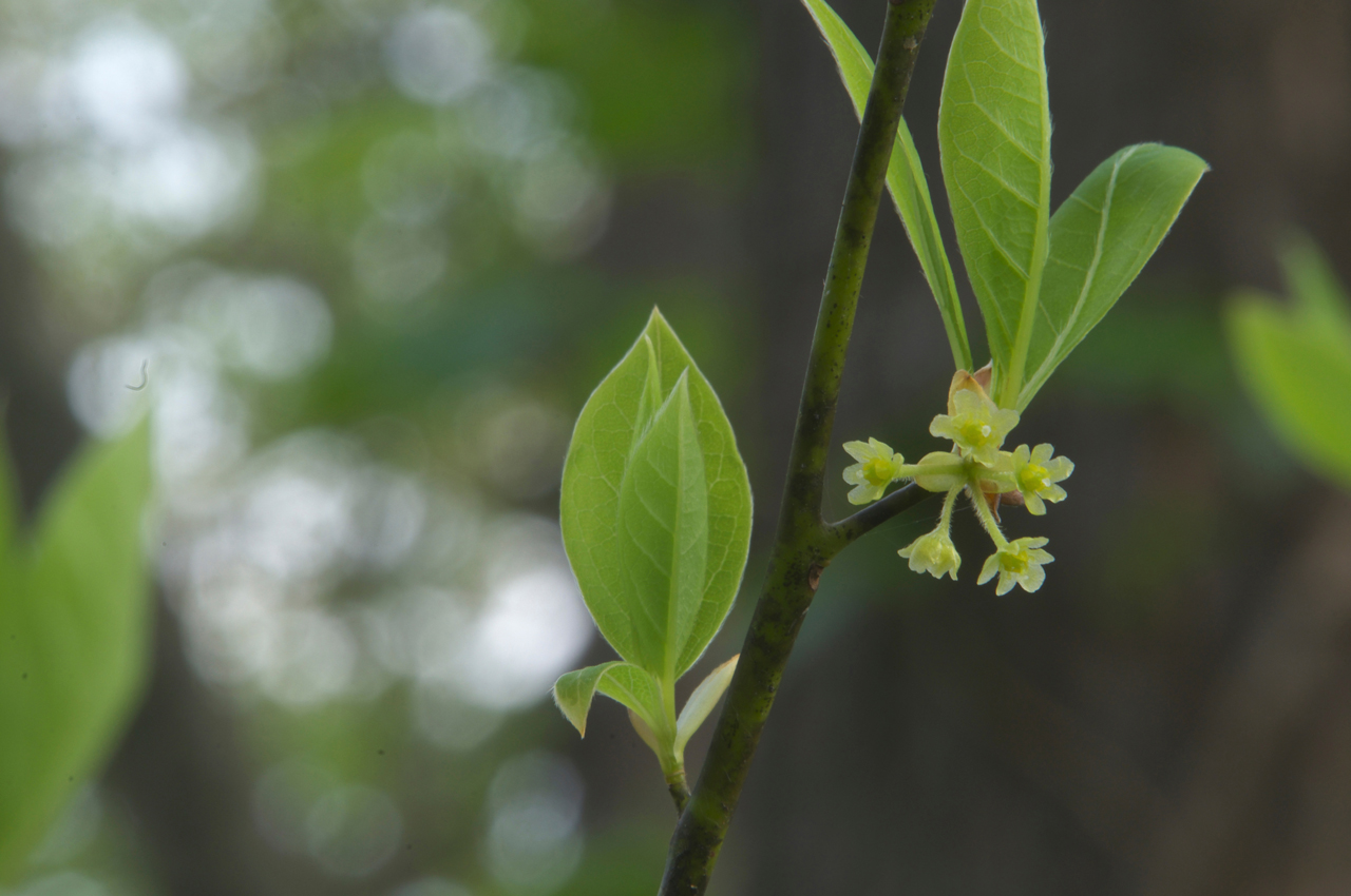 クロモジの花。はじめ、上を向いていた葉はやがてやがて横に展開する。果実が形成されると果柄が上向きに立ち上がり、果実が葉の上に現れる。