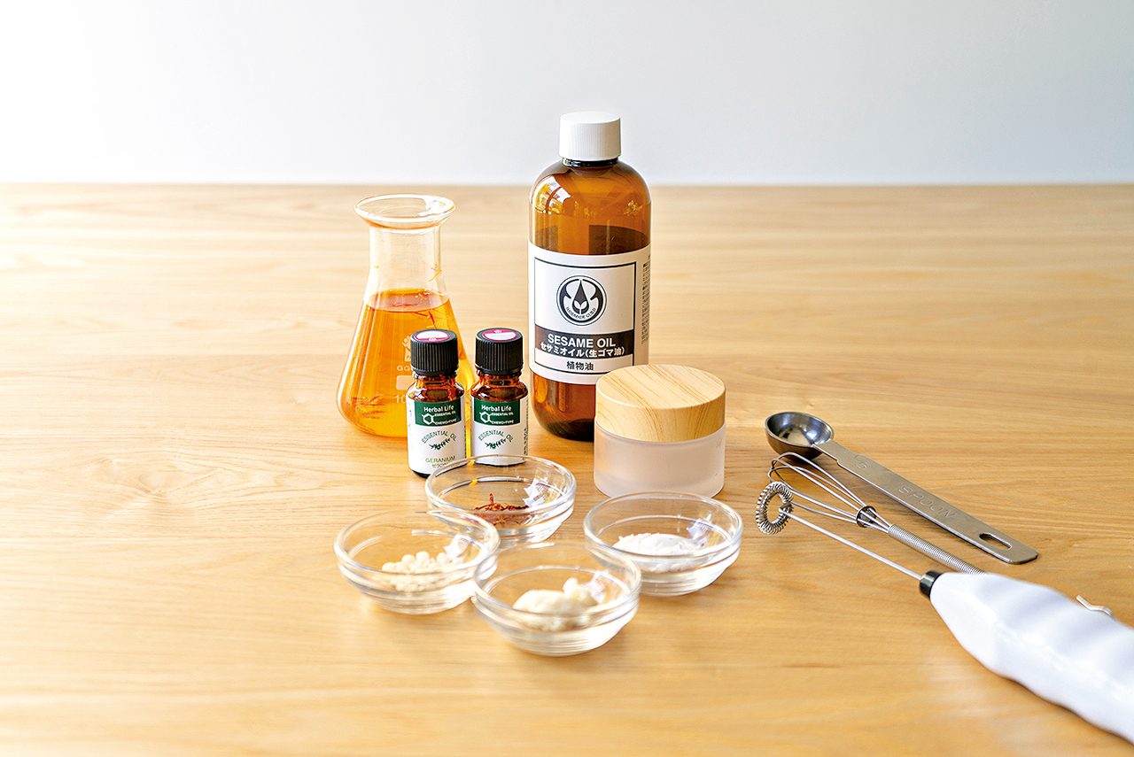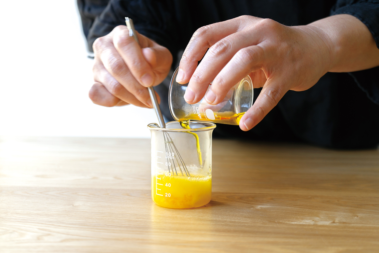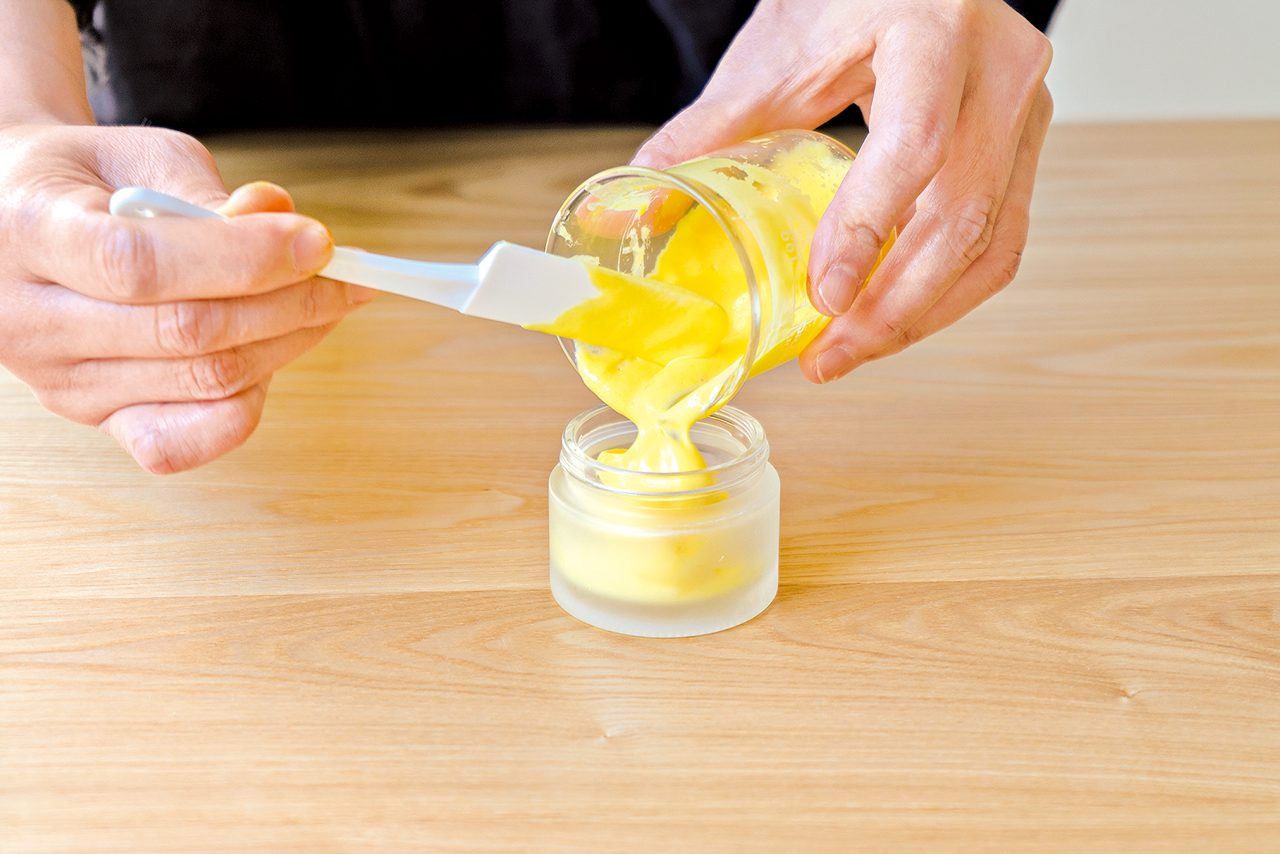⑦ クリーム状になったら、精油を入れ、ミニ泡立て器で混ぜ、ミニへらを使ってクリーム容器に入れて完成!化粧水で整えた後、顔全体、首やデコルテになじませてお使いください。