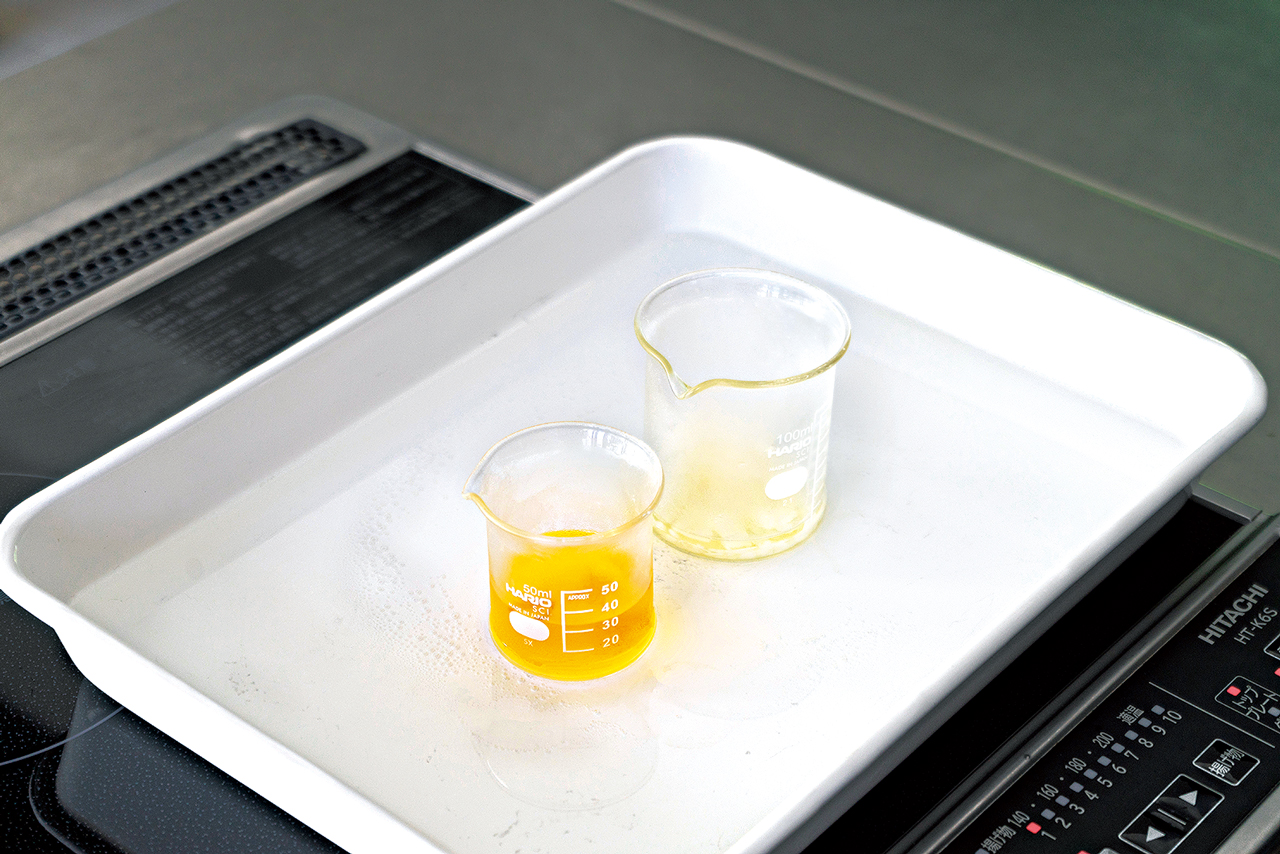 ④ ②と③を湯せんにかけ、②が完全に溶けたら、湯せんから外す。
