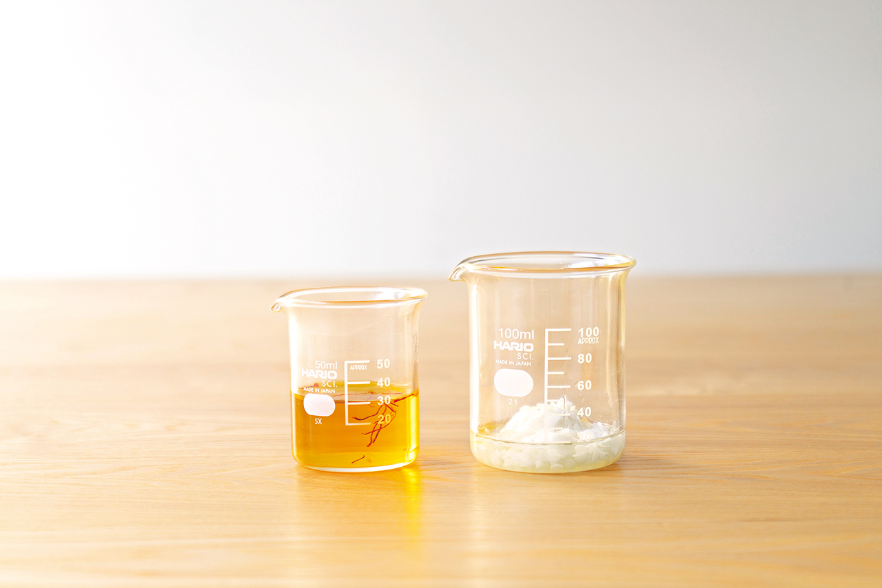 ① 精製水にサフランを入れ、3時間程度置き、浸出液を作っておく。