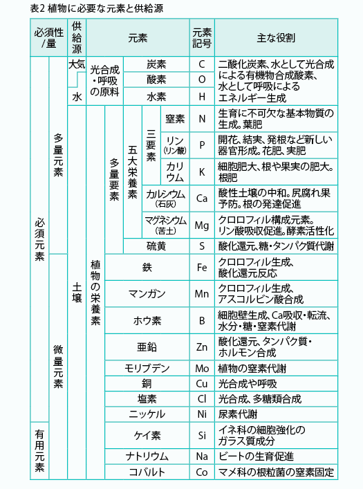 その他、植物にとって必須の微量元素、さらに、ある植物にのみ有用な微量元素があります(表2)。