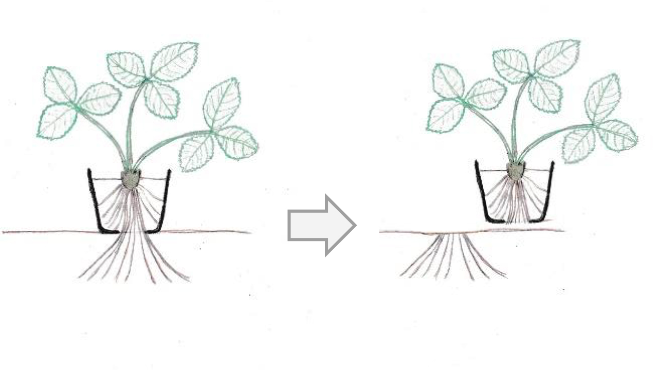 ポリポットで育苗しているイチゴ苗の根が鉢底穴から地面に伸びて地面から窒素を吸っている状態の時に、ポリポットを強制的にずらして根を切断する技術。