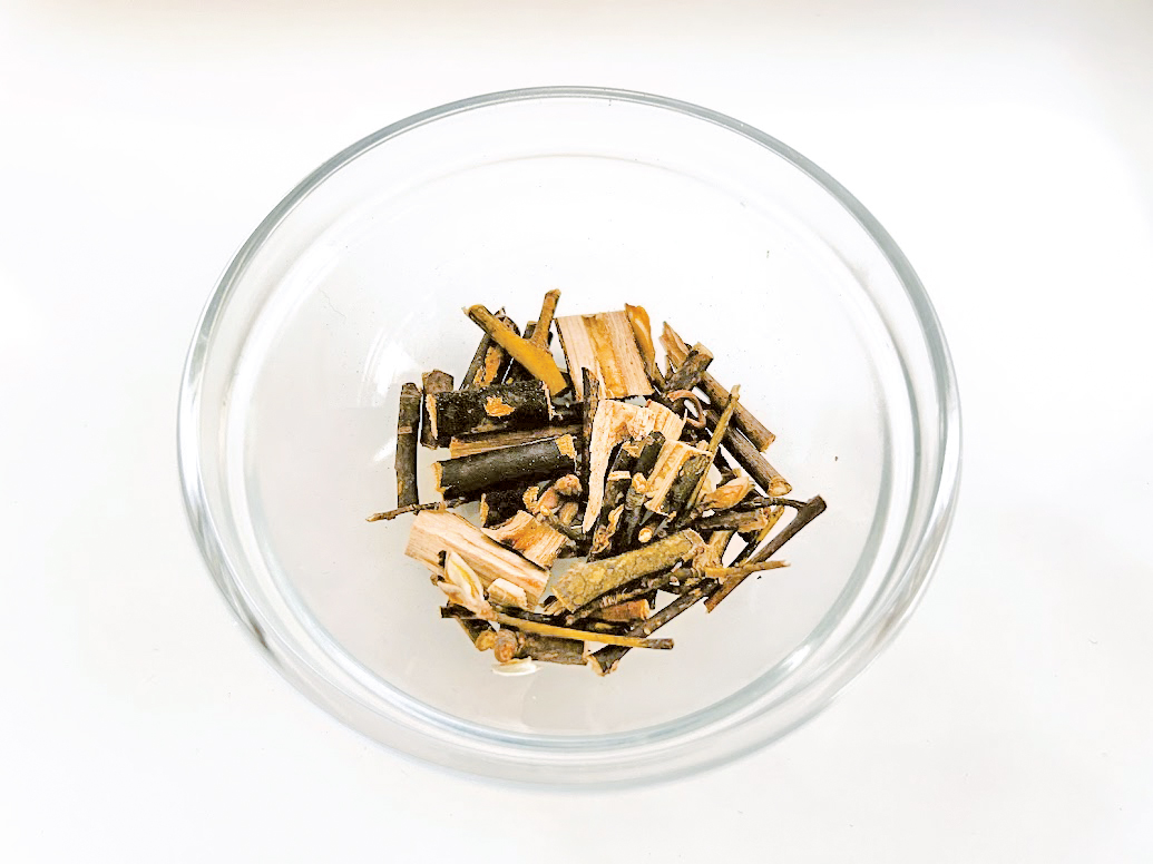 ❶水300mLが入った鍋を沸かし、クロモジの枝木を入れる。沸騰したら中火にして10分ほど煮出し、火を止めて冷ましておく。