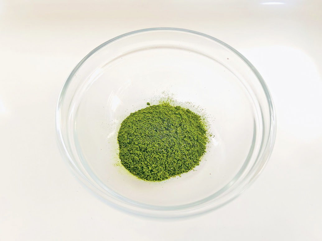 ❺茶碗に盛りつけて大葉の千切りとクロモジの葉のパウダーを振りかけていただく。
