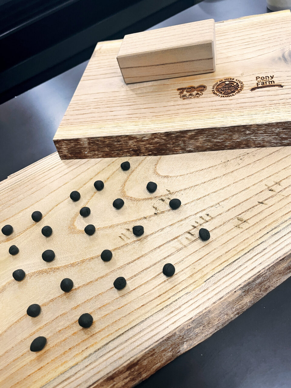 しかも使用するトレーはJAMHA×三光丸×ポニーの里の刻印入りキハダのトレー!三光丸の丸い粒を1つひとつ同じ大きさに成形するのはとても難しかったのですが、職人さん気分で楽しい思い出となりました。