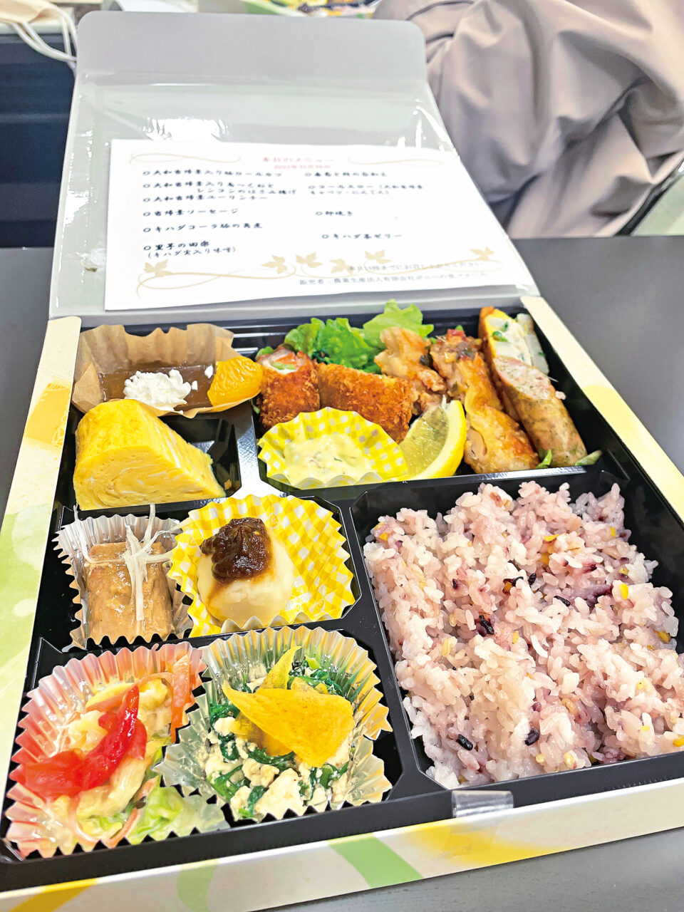 お楽しみの昼食タイムは、ポニーの里ファーム様特製、大和当帰やキハダをふんだんに使ったお弁当です。品数も多く豪華で、会員の皆様と次は何を食べようかとお話も盛り上がり、とてもおいしく身体が喜ぶお弁当でした。