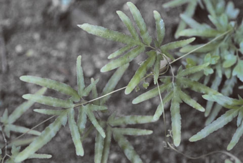 カニクサは、シダ類では珍しい巻きつく形の蔓植物で、別名「ツルシノブ」といわれている。民間薬としては、江戸時代の本草書に胞子が海金沙と記載されている。