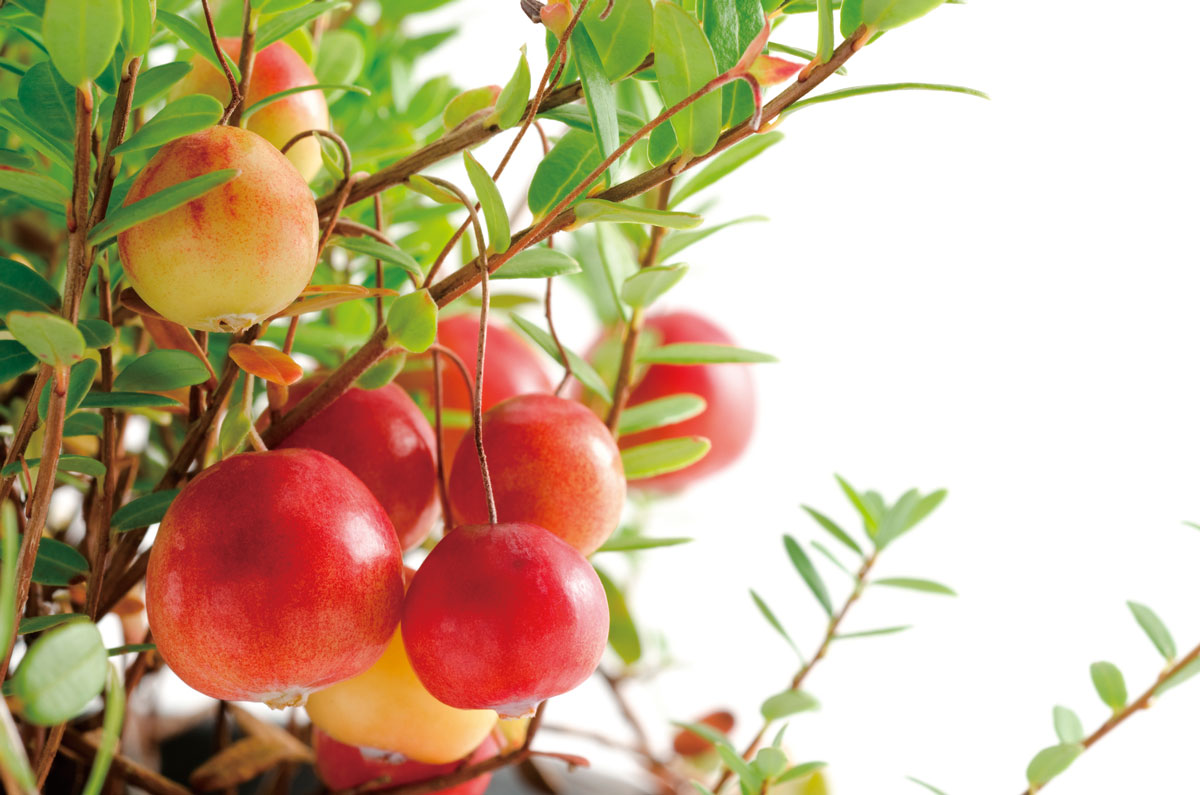 クランベリーの原産地は北半球亜寒帯地域で、湿地帯に生える常緑小低木です。高さ約10〜20cmの蔓性の植物で、小さな実は熟すると鮮やかな赤色になります。この小さな実が鶴の好物だったことや、花の形が鶴のくちばしに似ていることから、鶴(crane)のベリー(berry)が名前の由来とされています。
