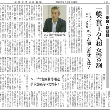 令和元年6月6日付の「健康産業流通新聞」にて、日本メディカルハーブ協会 金田太朗専務理事のインタビュー記事が紹介されました。 →金田太朗専務理事のインタビュー記事はこちら
