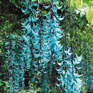 今回は本土では見ることの少ない八重山独特の蔓つる性植物をたずねてみましょう。 ●ヒスイカズラ 長さ20m以上にも伸びる蔓性のヒスイカズラ。植物とは思えない翡翠色をした独特の形状の花を一房に150ほど下垂させ、藤棚のように周囲を埋め尽くします。フィリピンのルソン島周辺が原産ですが、・・・