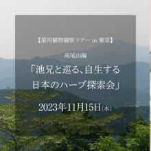 野草研究家の山下智道先生をお招きし、千葉県大多喜町にて薬草観察と蒸留見学を行う特別企画! 今回は、山下先生に終日同行していただき、バスツアー形式でたっぷりと植物の魅力を学びます。午前は、1月にリニューアルオープン予定の大多喜有用植物苑へ。リニューアルに伴い、植物監修をされた山下・・・