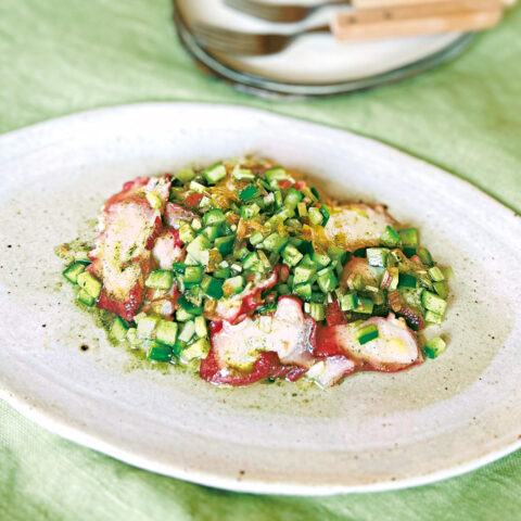 季節のハーブを楽しむレシピ : クロモジ風味タコの和風カルパッチョ