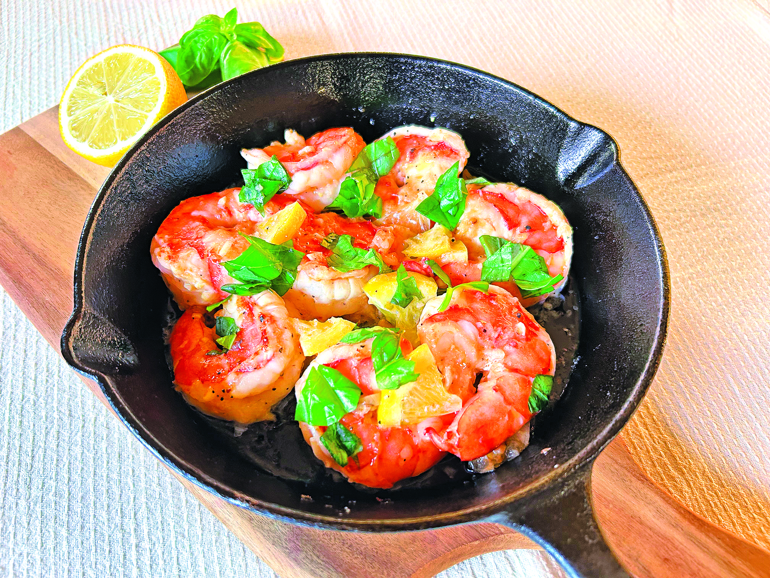 レモン&バジルのガーリックシュリンプ いつものガーリックシュリンプをレモンとバジルの風味でさわやかにいただくレシピです。 材料 ブラックタイガー海老 特大8尾 A・ニンニク(みじん切り)…1片・塩レモンの汁(★)…大さじ1・塩レモン(★)…1/3個 ・オリーブオイル…大さじ1 ・・・・